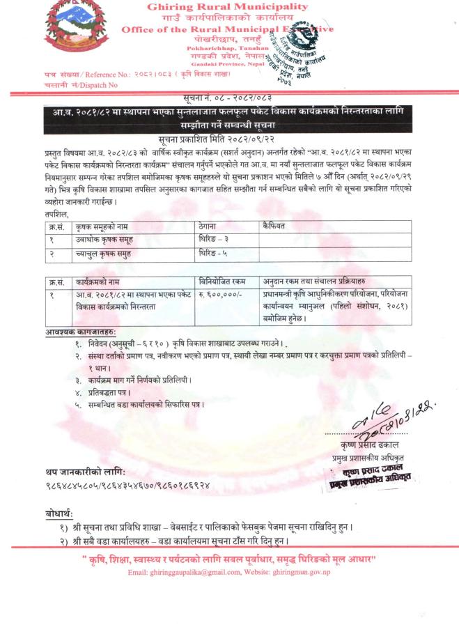 आ.व २०८१।८२ मा स्थापना भएका सुन्तलाजात फलफूल पकेट विकास कार्यक्रमकाे निरन्तरताकाे लागि सम्झाैता गर्ने सम्बन्धी सूचना ।।