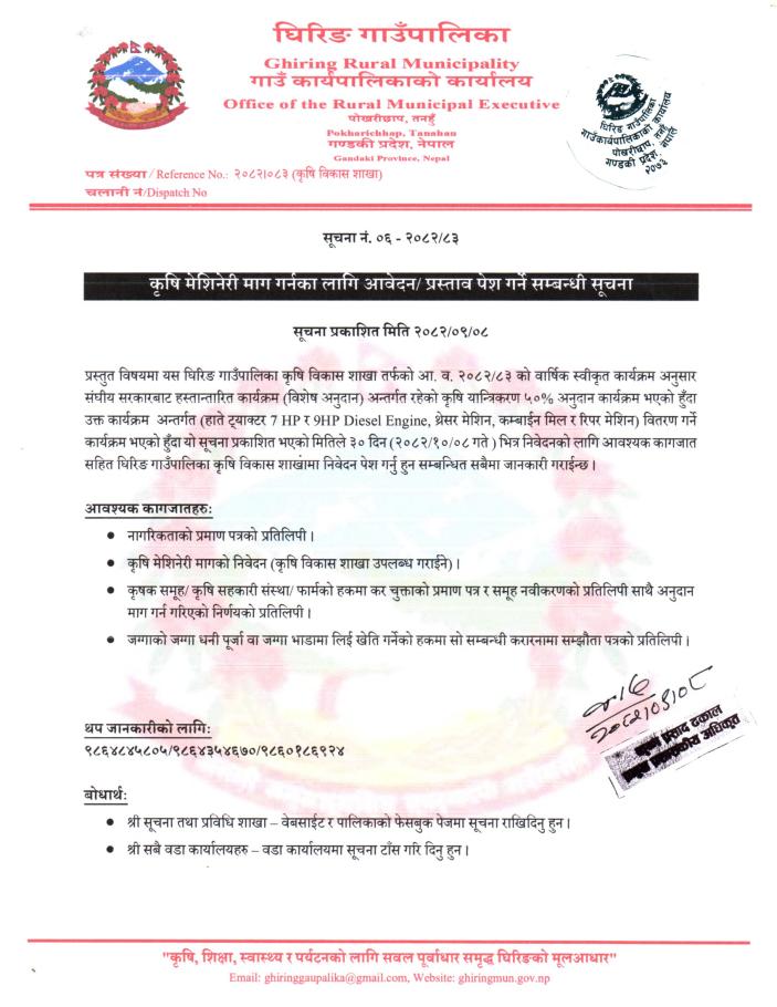 » कृषि मेशिनेरी माग गर्नका लागि आवेदन/प्रस्ताव पेश गर्ने सम्बन्धी सूचना ।।।