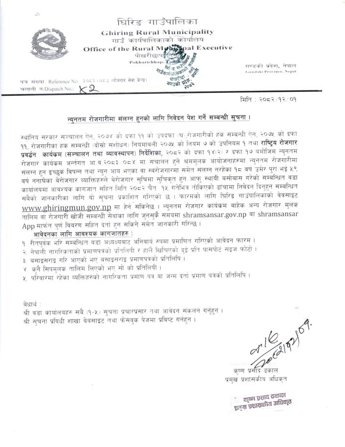 न्यूनतम रोजगारीमा संलग्न हुनकाे लागि निवेदन पेश गर्ने सम्बन्धी सूचना ।।।