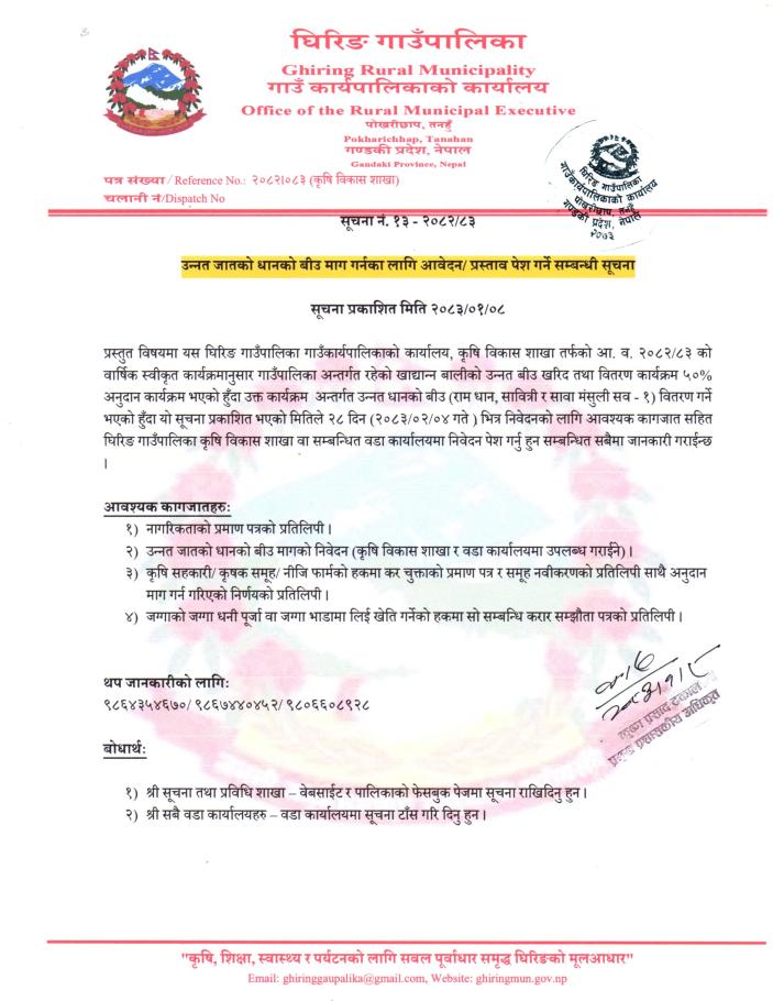उन्नत जातकाे धानकाे बीउ माग गर्नका लागि आवेदन/प्रस्ताव पेश गर्ने सम्बन्धी सूचना ।।।