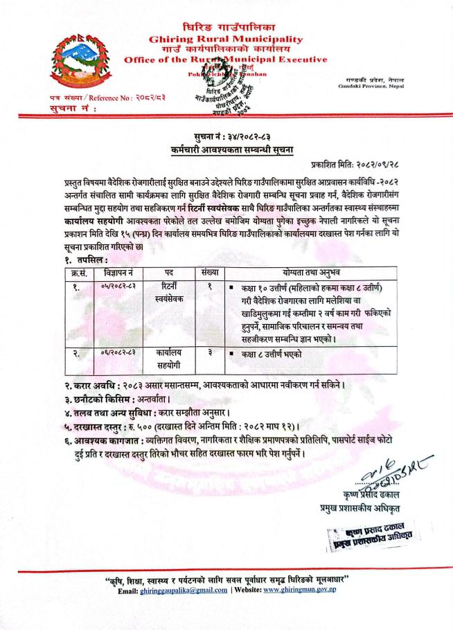 » कर्मचारी आवश्यकता सम्बन्धी सूचना ।।।