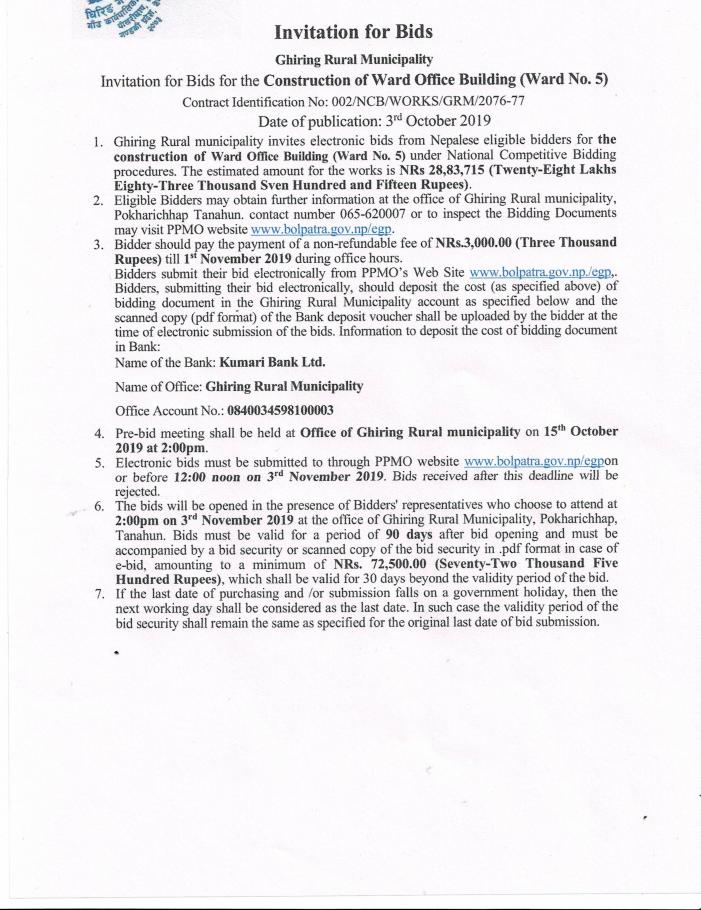गाउँपालिका भवन र वडा भवनकाे ठेक्का सम्बन्धी सिलबन्दी बाेलपत्र अाहावनकाे सूचना
