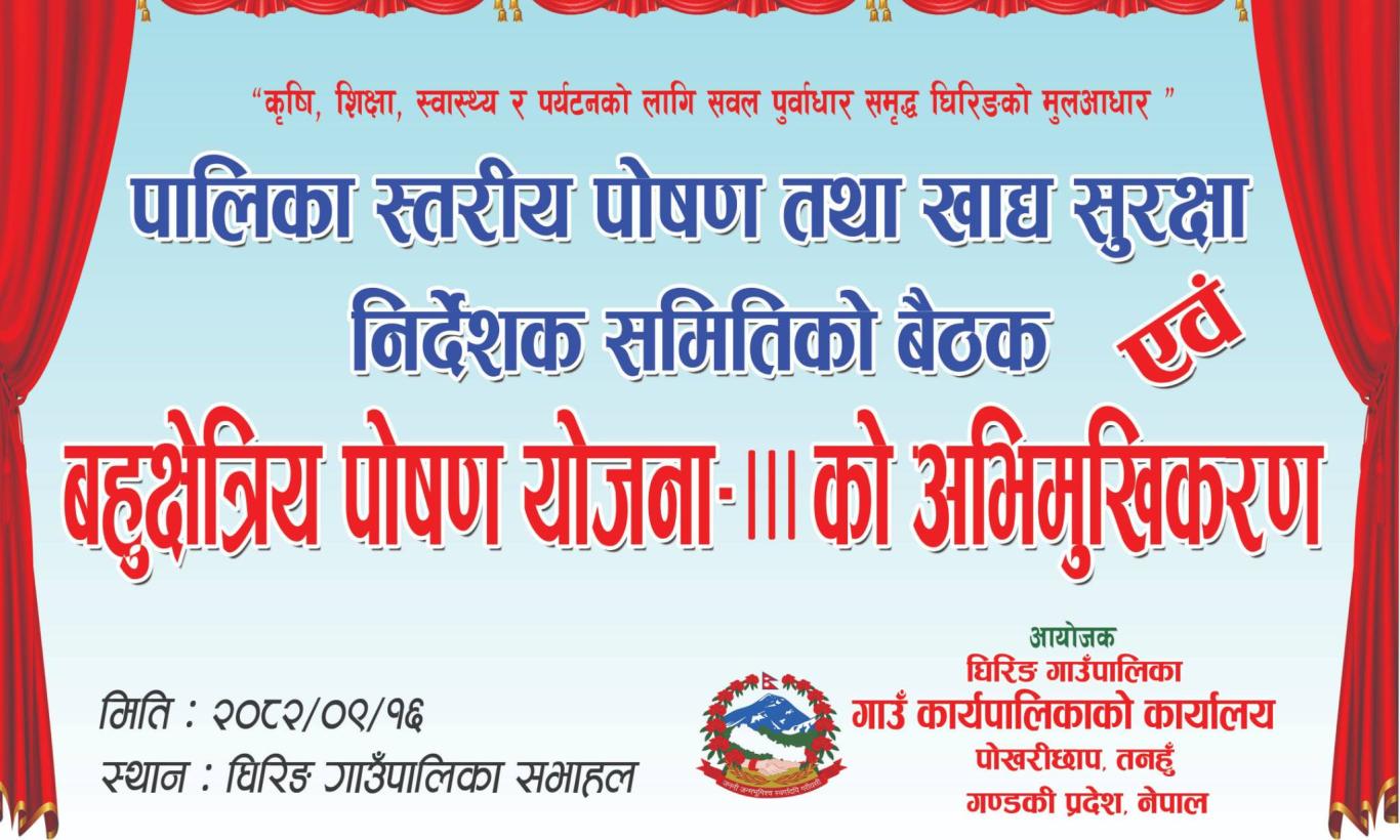 घिरिङ गाउँपालिकाको आयोजनामा बहु क्षेत्रीय पोषण योजना तेस्रो सम्बन्धिअभिमुखिकरण तथा पोषण खाध्य सुरक्षा तथा निर्देशक समितिको बैठकका क्रममा लिइएका तस्विरहरू ।।।