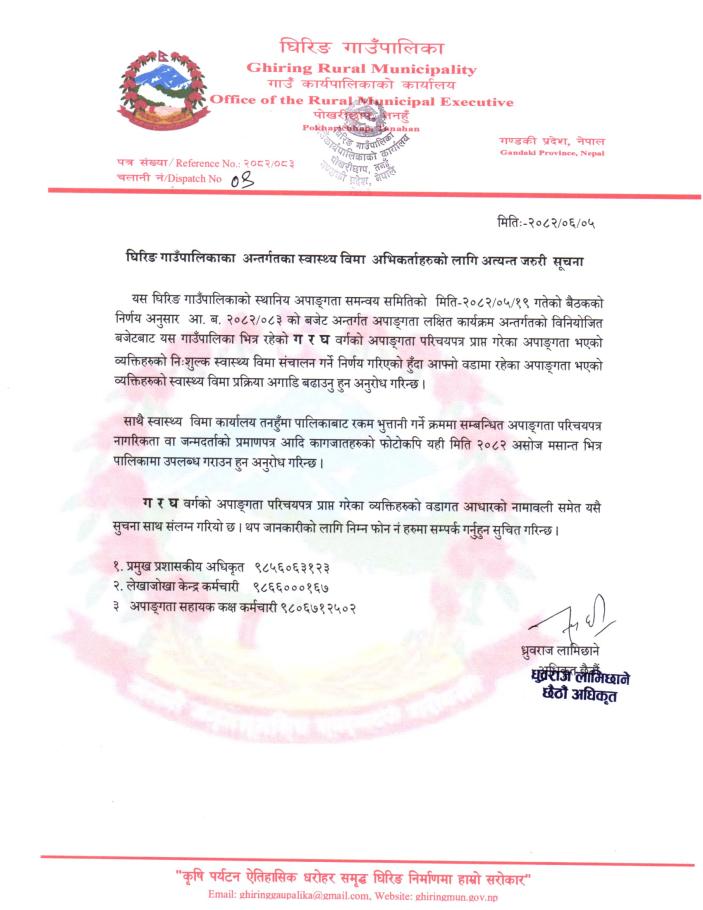 घिरिङ गाउँपालिका अन्तर्गतका स्वास्थ्य विमा अभिकर्ताहरूकाे लागि अत्यन्त जरूरी सूचना ।।।