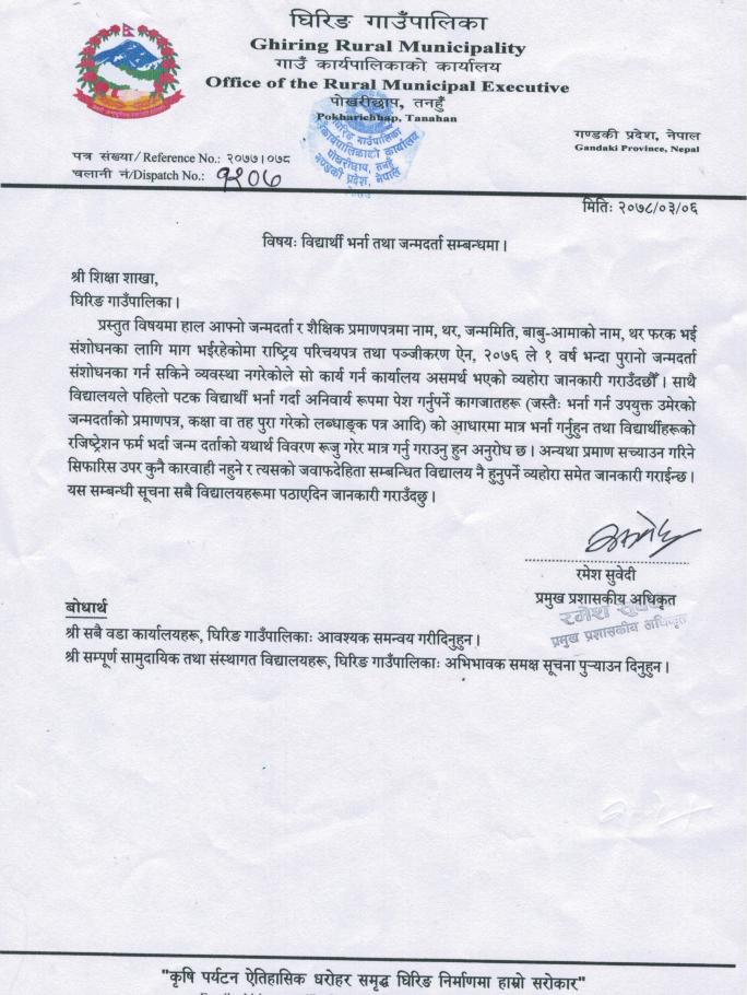 विद्याथी भर्ना तथा जन्म दर्ता सम्बन्धमा