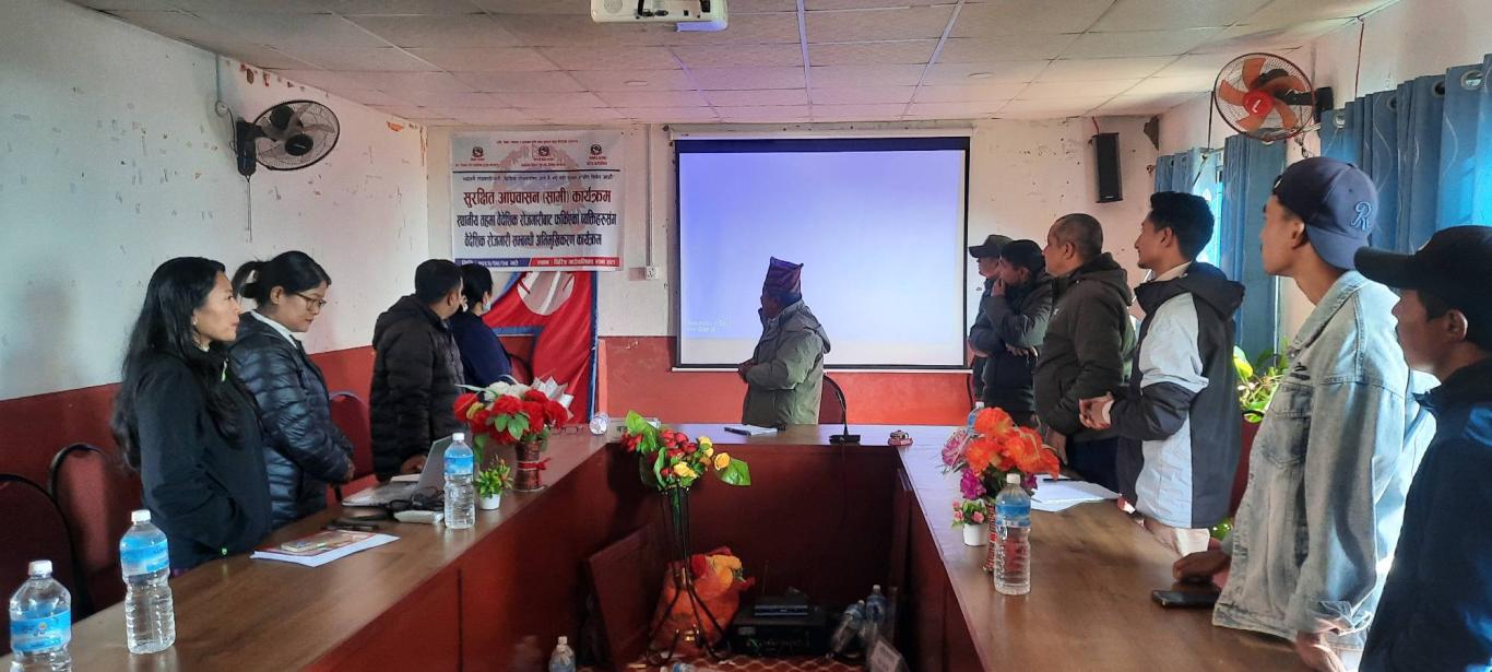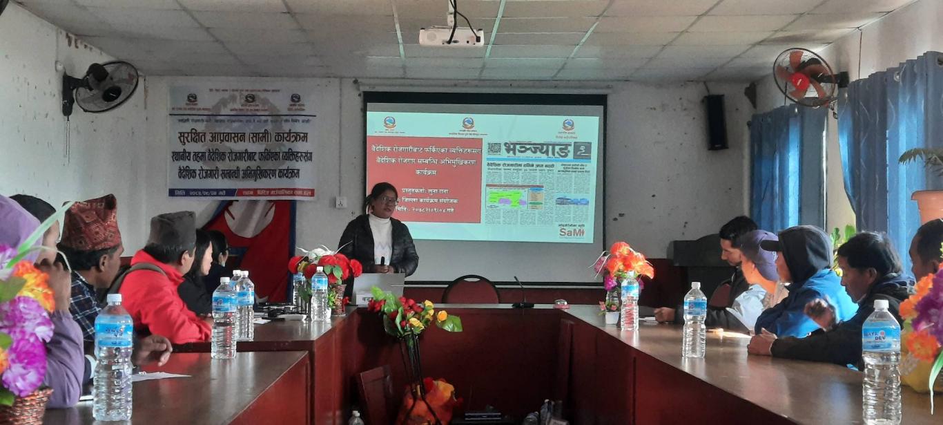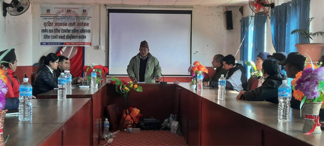 "सुरक्षित आप्रवासन(सामि)कार्यक्रम " स्थानीय तहमा वैदेशिक राेजगारीबाट फर्किएका व्यक्तिहरूसंग वैदेशिक राेजगारी सम्बन्धि अभिमूखिकरण कार्यक्रममा लिईएका दृश्यहरू ।।